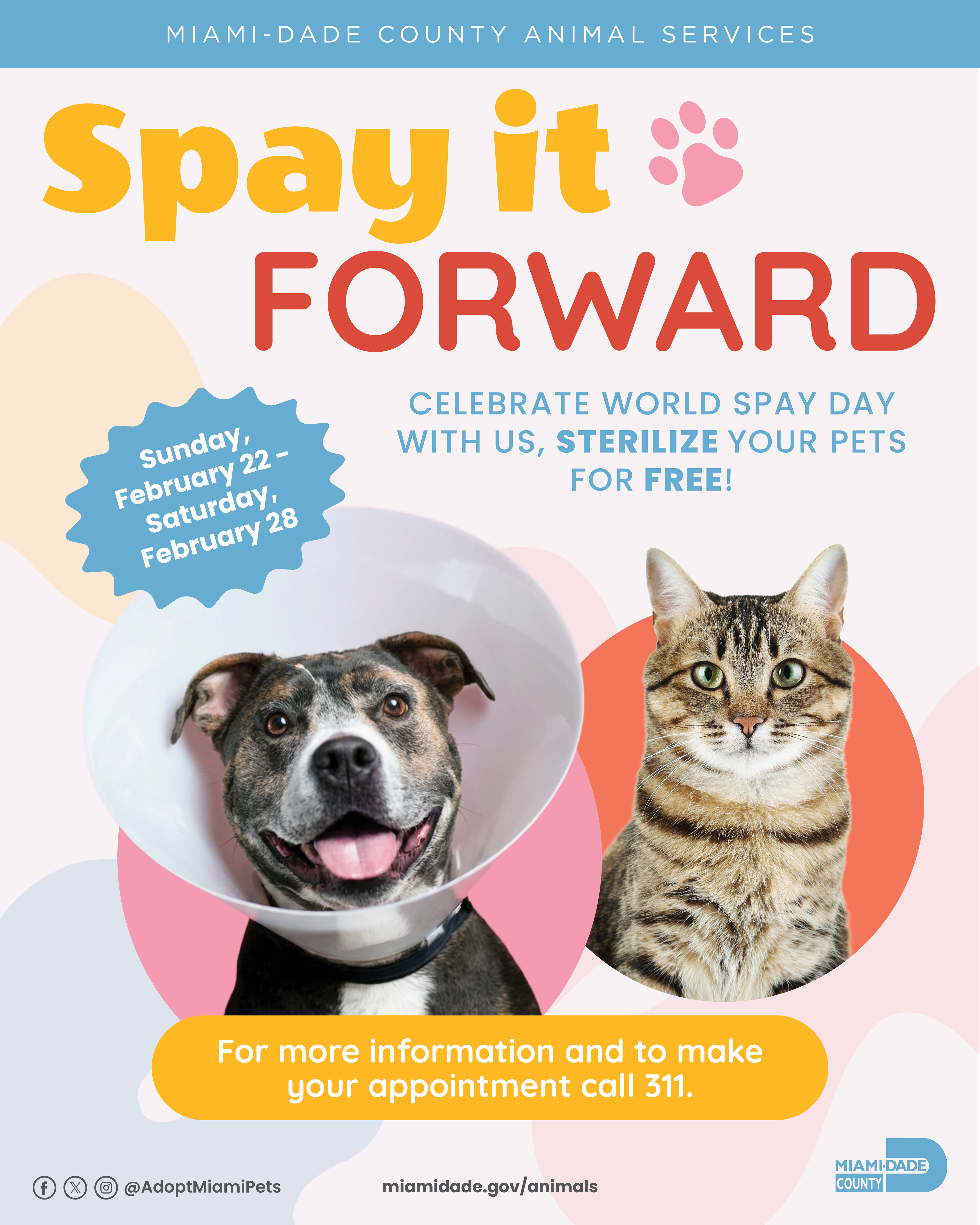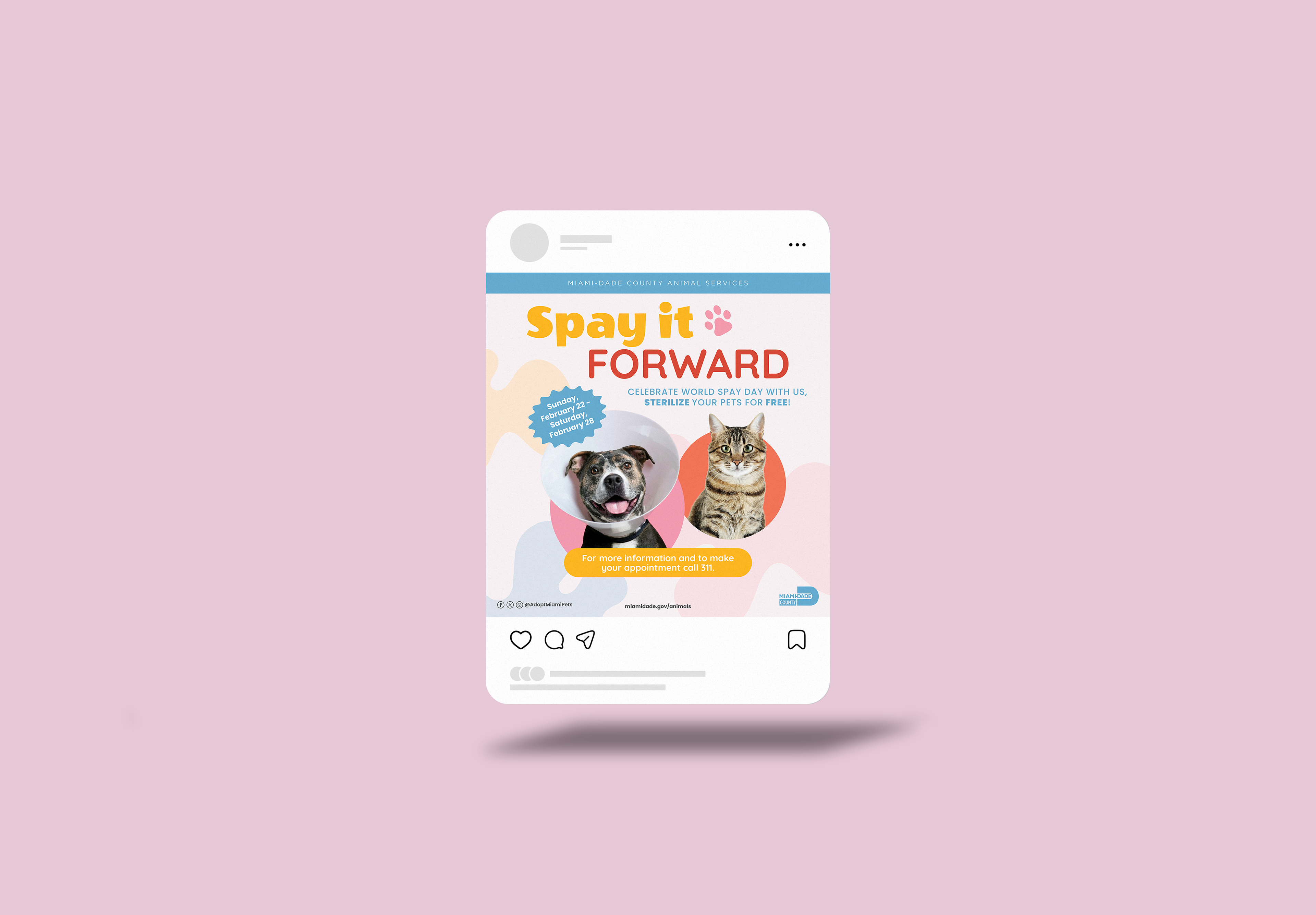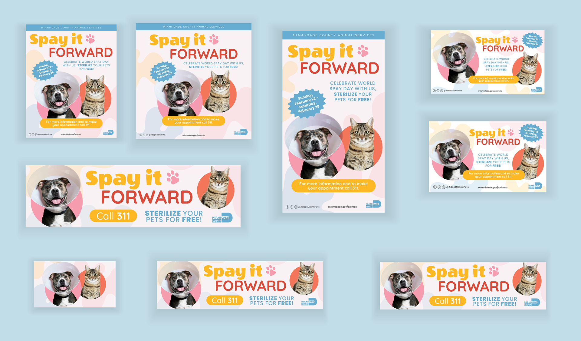 Spay It Forward is a public-service branding campaign created to promote free pet spaying and sterilization services in Miami-Dade County. The campaign uses playful, colorful shapes and friendly visual language to make an often serious topic feel approachable, positive, and community-driven. By pairing bright, joyful design with a lighthearted play on words, Spay It Forward encourages pet owners to take action.